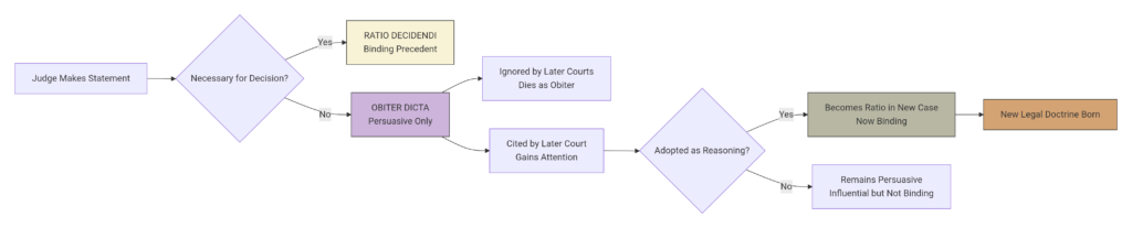 - For Theorists: Question whether the ratio/obiter distinction is even coherent. Legal realists argue that later courts decide what the “true” ratio was—meaning obiter is whatever a later judge says it is.