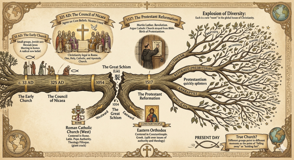 [Visual Timeline Image: A horizontal timeline from 33 AD to Present Day, with key branching points labeled. The line starts as a single trunk, then splits into branches at 1054 and 1517, with many smaller branches sprouting after 1517.]