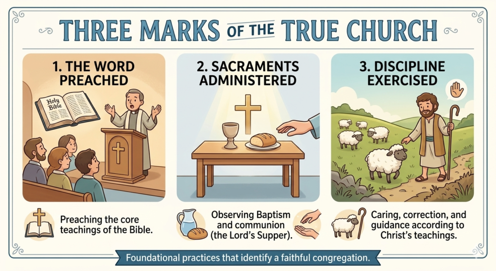 [Short Explainer Illustration: A simple drawing of a Bible open on a pulpit (the Word Preached), a simple table with a cup and bread (Sacraments Administered), and a shepherd gently guiding a sheep (Discipline Exercised).]
